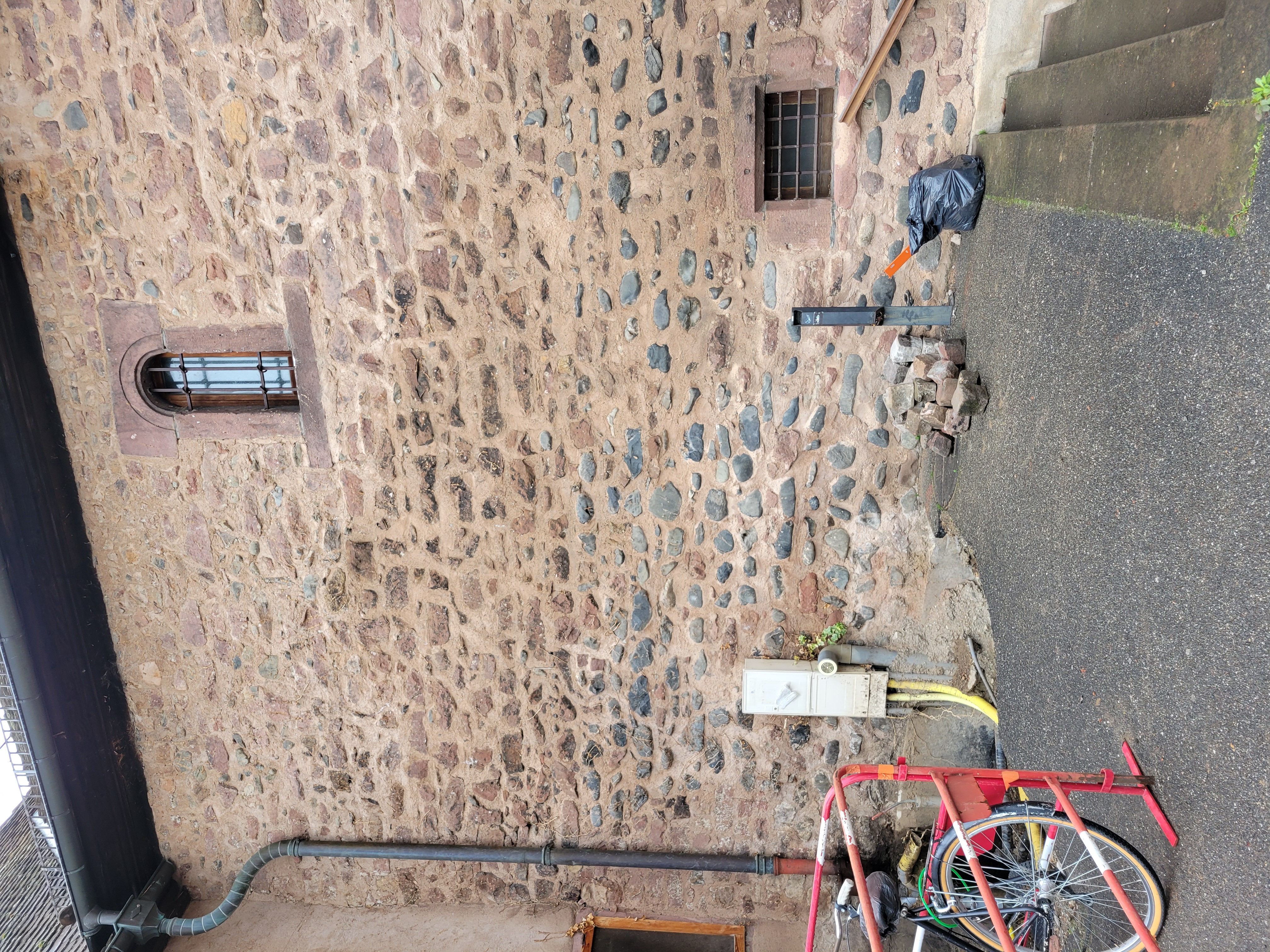Avril : les travaux de démolition (escaliers, dalle). La création d’une ouverture PMR, avec une nouvelle entrée et une nouvelle porte en bois pleine et contour en grès, permettant d’accueillir des personnes en fauteuil roulant. Actuellement, il y a deux cages d’escalier, une des deux va être détruite pour pouvoir créer cet accès PMR. Le plus gros travail va être de démolir la cage d’escalier et de couler la nouvelle dalle.
