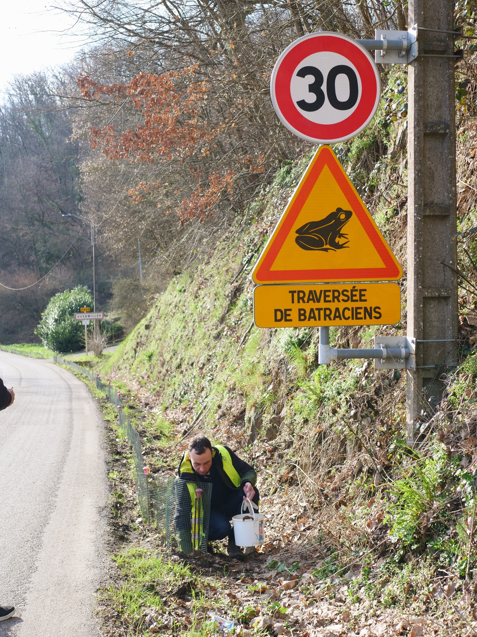 L’opération Il faut sauver le crapaud commun a été lancée au printemps 2020 à Guebwiller. Le service Environnement de la Ville a tout organisé pour que la période des amours des batraciens (fin février à avril) ne se finisse pas sous les roues des véhicules. A la sortie de Guebwiller, en direction de Buhl, au niveau de la Pizzeria du lac, les agents des services techniques de la Ville ont installé 300 mètres de filets et mis en place des espaces de récupération des batraciens. L’objectif : sauver un maximum de bébêtes qui vivent dans les alentours du château du Hugtsein. Un panneau de signalisation pour sensibiliser les automobilistes a également été mis en place.