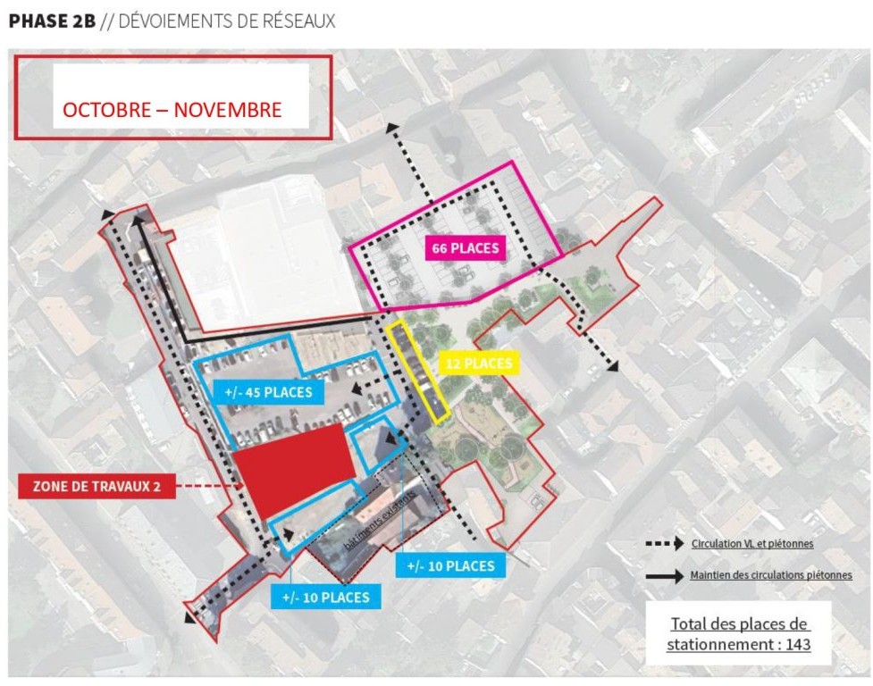 À partir du 22 septembre, des travaux sur le dévoiement des réseaux devraient durer jusqu’à fin novembre. Les zones de stationnement et de circulations évolueront selon l’avancement du chantier de cette deuxième phase (voir schémas PHASE 2A ET 2B).