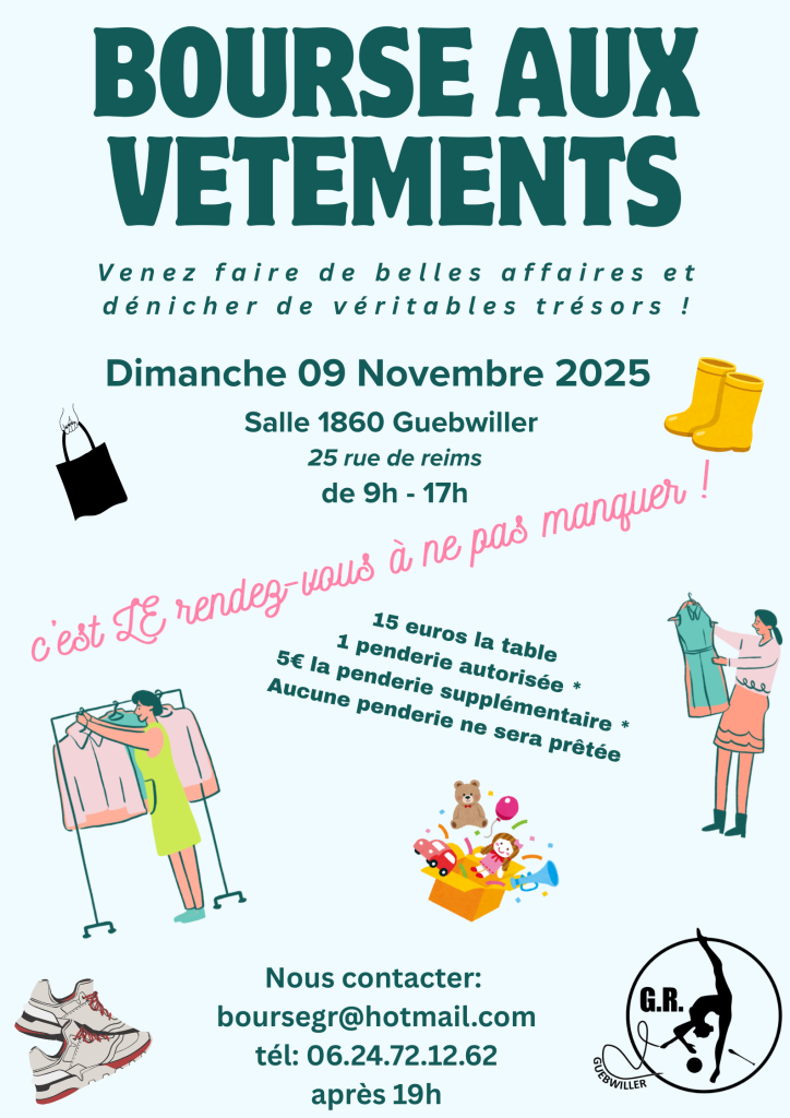 Le dimanche 9 novembre 2025, la salle 1860 se transformera en un véritable paradis des bonnes affaires à l’occasion de la bourse aux vêtements organisée par le Club de gymnastique rythmique de Guebwiller.