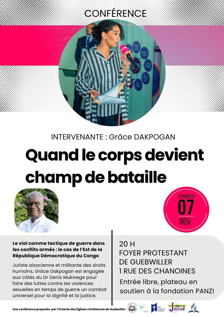 Le viol comme tactique de guerre dans les conflits armés : le cas de l’Est de la République démocratique du Congo (RDC) sera la thématique de la conférence animée par Grâce Dakpogan, juriste alsacienne et militante des droits humains, engagée aux côtés du Dr Denis Mukwege, un gynécologue et fondateur de l’hôpital Panzi à Bukavu. Lauréat du Prix Nobel de la Paix en 2018, le Dr Mukwege est reconnu pour son action en faveur des femmes victimes de violences sexuelles, un engagement qui lui a valu le titre de “l’homme qui répare les femmes”.