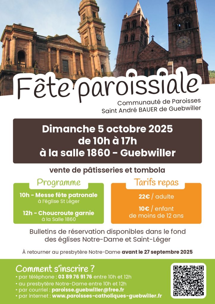 Dimanche 5 octobre 2025, la communauté de Paroisses Saint André Bauer de Guebwiller vous donne rendez-vous pour sa fête paroissiale, un moment de fraternité et de partage ouvert à tous, à la salle 1860 de Guebwiller.
